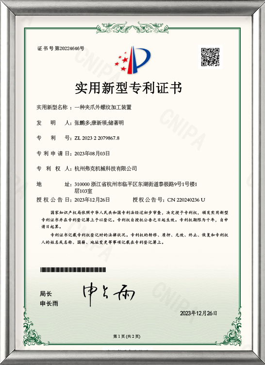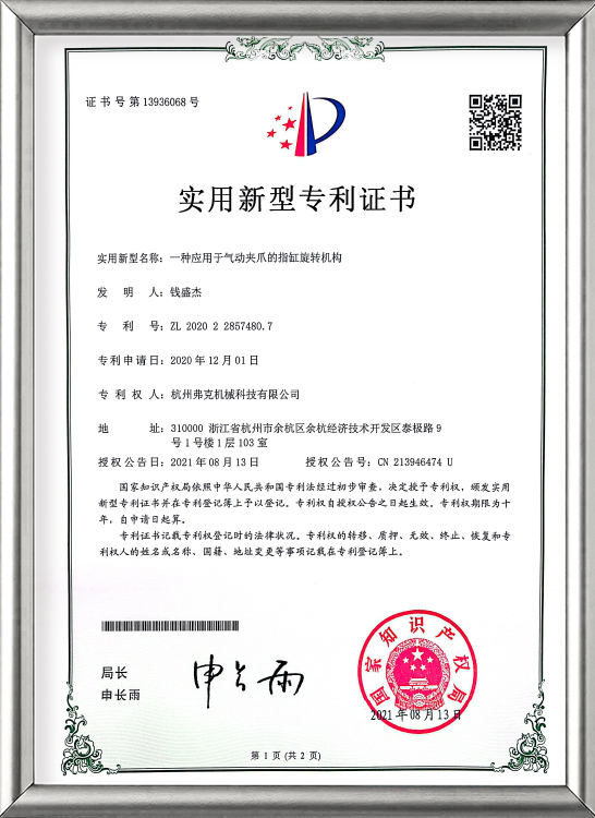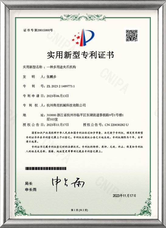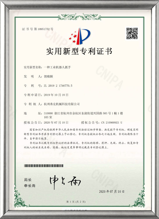 An Industrial Robot Gripper - Utility Model Patent Certificate