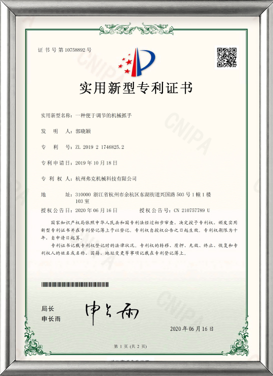 An Adjustable Mechanical Gripper - Utility Model Patent Certificate